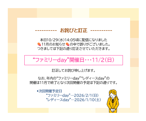 追って“訂正とお詫び”を配信いたしましたが弊社都合によりLINEメッセージの上限が超えたため、下記内容が正しく配信されませんでした。この様なことからホームページ上で先にご報告させていただきます。11月1日あさ9時に再度配信させていただきます。大変申し訳ございませんでした。